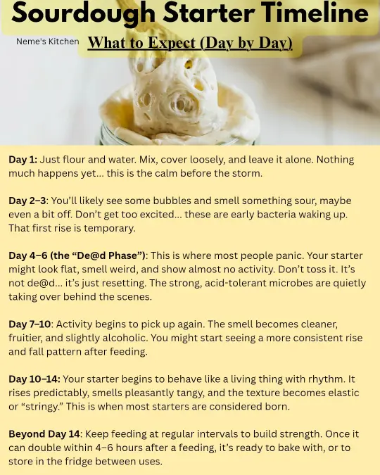 - Step 2: Observe the starter. You should start to see consistent bubbling and a noticeable rise in volume after each feeding. It should also have a slightly sour, pleasant smell.