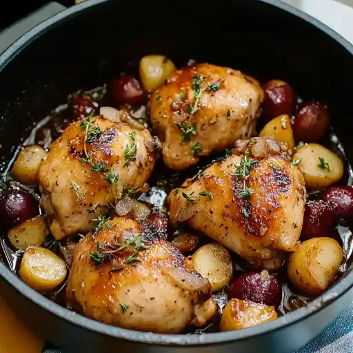 Step 7: Serve: Spoon the apple cider glaze generously over the top of the chicken. Garnish with thinly sliced apples or fresh thyme sprigs for an elegant presentation. Serve immediately and enjoy the delectable combination of sweet and savory flavors.