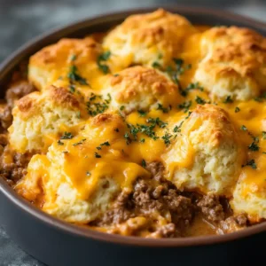 Short Description A hearty dish of ground beef, cheddar cheese, and garlic-butter biscuits baked together for the ultimate comfort classic. …