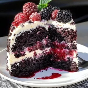 A decadent and visually stunning layer cake featuring a rich, dark chocolate cake, creamy vanilla frosting, and a vibrant mixed …