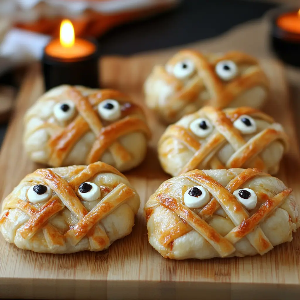 Final Step: Brush the exterior of the mummies generously with the egg wash for a lovely golden color during baking. Place them in the preheated oven and bake for 15-20 minutes, or until the pastry is golden brown and the cheese is wonderfully melted. Once out of the oven, decorate with candy eyes or mini chocolate chips, and serve warm!