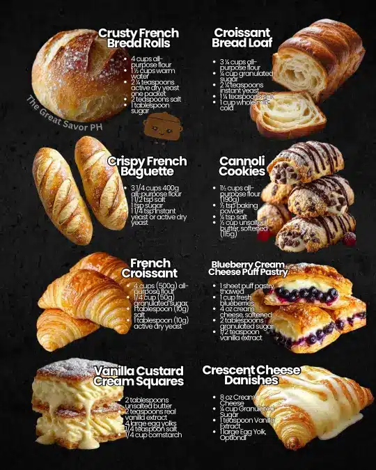 Love bakery-style treats? This ultimate French baking recipe collection features crusty French bread rolls, crispy baguettes, soft bread loaves, buttery croissants, cannoli cookies, blueberry cream cheese puff pastry, vanilla custard cream squares, and crescent cheese danishes. Perfect for home bakers, weekend baking, and anyone who loves European-style pastries, these recipes bring bakery-quality results right to your kitchen. Save this pin for baking inspiration, pastry recipes, and irresistible homemade desserts!