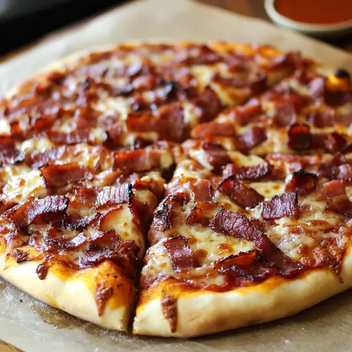 Description: Sweet, smoky, and savory—this barbecue bacon pizza is loaded with bold flavors from tangy BBQ sauce, crispy bacon, gooey cheese, and your favorite toppings. A guaranteed hit for pizza night. This recipe elevates the classic pizza experience by combining the irresistible flavors of barbecue, bacon, and cheese. It’s perfect for a casual weeknight dinner, a game-day gathering, or any occasion where you want a crowd-pleasing dish. The combination of sweet and smoky barbecue sauce, crispy bacon, and melted mozzarella creates a symphony of flavors that will tantalize your taste buds. The addition of red onion adds a sharp, tangy bite, while the optional red pepper flakes provide a subtle kick. Whether you use store-bought dough for convenience or make your own for a truly homemade experience, this recipe is versatile and easy to customize. Feel free to add your favorite toppings like grilled chicken, pineapple, or jalapenos to create your own signature barbecue bacon pizza. This recipe is designed to be simple and straightforward, allowing you to enjoy a delicious, gourmet-style pizza without spending hours in the kitchen. The key is to use high-quality ingredients and to not overcrowd the pizza, ensuring that each flavor shines through. The crust should be crisp and golden, the cheese bubbly and melted, and the bacon perfectly crisp. It’s a delightful dish that brings together the best of comfort food with a unique twist.