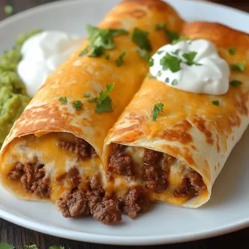 Description: These Beef and Cheese Chimichangas are a crispy, cheesy, and flavorful delight, perfect for a satisfying weeknight dinner or a fun weekend gathering. Filled with seasoned ground beef and a generous blend of cheddar and Monterey Jack cheeses, these chimichangas are fried to golden perfection and served with your favorite toppings like salsa, sour cream, and guacamole. Get ready for a fiesta in your mouth with every bite!