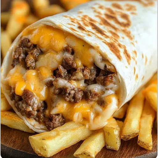 A hearty and satisfying wrap filled with seasoned ground beef, crispy fries, and a creamy cheese sauce. Perfect for a quick and delicious meal.