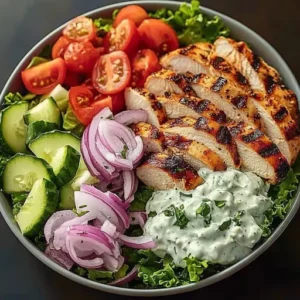 Description: This vibrant and healthy Loaded Grilled Chicken Greek Salad Bowl is a delightful combination of fresh, crisp vegetables, savory …