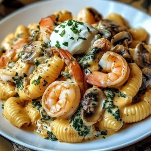 Description: Plump shrimp, tender shell pasta, earthy mushrooms, and wilted spinach unite in a luxurious, garlicky cream sauce that offers …