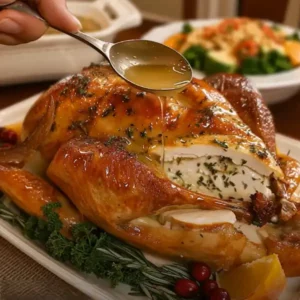 Description A golden-brown roasted turkey brushed with fragrant herb butter and drizzled with pan juices for that glossy, irresistible finish. …