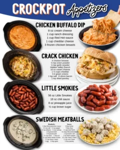 1. Chicken Buffalo Dip (Crock Pot) Ingredients Instructions Notes Nutrition Calories: 317kcal | Carbohydrates: 3g | Protein: 19g | Fat: 26g | Saturated Fat: 9g | Polyunsaturated Fat: 8g | Monounsaturated Fat: 6g | Trans Fat: 1g | Cholesterol: 88mg | Sodium: 1220mg | Potassium: 308mg | Fiber: 1g | Sugar: 1g | Vitamin A: 447IU | Vitamin C: 2mg | Calcium: 115mg | Iron: 1mg 2. Crock Pot …