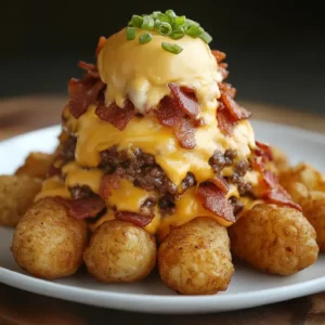 Description Golden crispy tater tots piled high with juicy ground beef, melty cheddar & mozzarella, and crispy bacon bits… what’s …