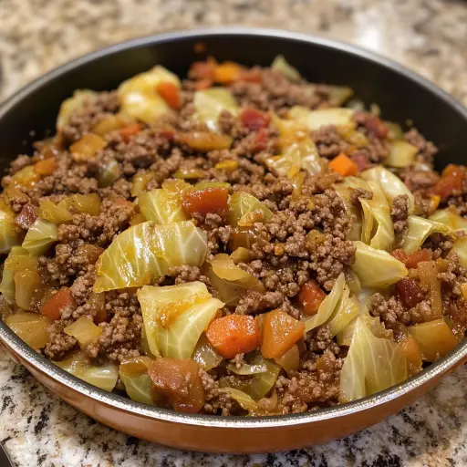 Description: A hearty and comforting one-pan dish featuring savory ground beef, tender cabbage, and flavorful spices simmered in a rich tomato base. This recipe is a quick and easy way to enjoy a nutritious and satisfying meal, perfect for busy weeknights.