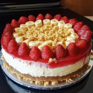 Description: A delightful fusion of creamy cheesecake, sweet strawberries, crunchy golden Oreos, and comforting banana pudding, all in one decadent …