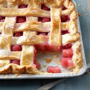 Description: This Raspberry-Rhubarb Slab Pie is a delightful and easy-to-make dessert, perfect for feeding a crowd. The tartness of the …