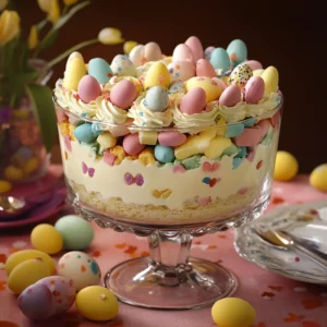 Description: This Easter Trifle is a show-stopping dessert that beautifully combines the light, airy texture of pastel-colored cake, the creamy …