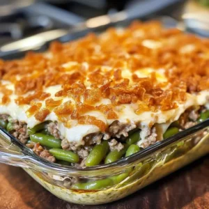 Description: Layers of seasoned beef, tender green beans, creamy cheese sauce, and golden fried onions—this gooey, crispy-topped casserole is pure …