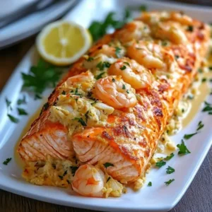 Description: A seafood lover’s dream dinner! This juicy salmon fillet is generously loaded with buttery crab, succulent shrimp, and aromatic …