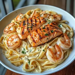 Description: This exquisite dish brings together the best of land and sea, featuring flaky, grilled salmon and succulent shrimp, tossed …