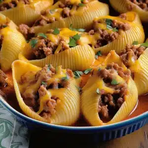 Description: Jumbo pasta shells overflowing with a savory taco-seasoned ground beef and refried bean filling, smothered in salsa, and topped …