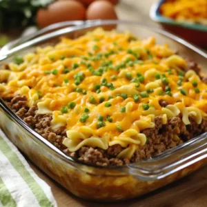 Description: A comforting and hearty casserole featuring ground beef, tender egg noodles, vibrant vegetables, and plenty of melty cheddar cheese. …
