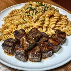Description: Tender, juicy garlic butter steak bites served over a bed of creamy, spicy Cajun Alfredo twisted pasta. This dish …