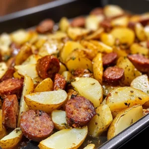 This hearty dish combines the robust flavors of smoked sausage with tender roasted potatoes and caramelized onions, all topped with …