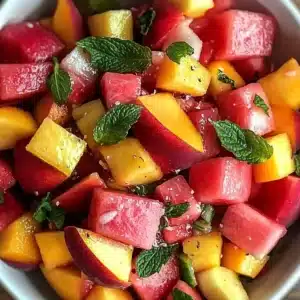 Description: This Peach Watermelon Salad is the embodiment of summer refreshment. A vibrant mix of sweet watermelon, juicy peaches, crisp …