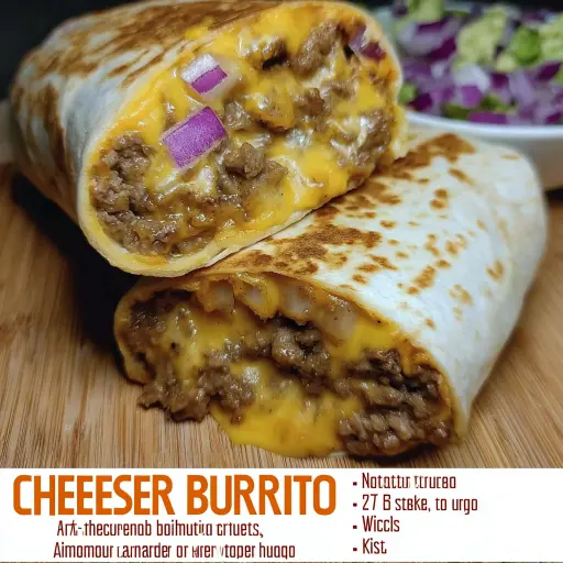 Description: Dive into the decadence of a Cheeseburger Burrito, inspired by the iconic “animal style” flavors. This recipe combines seasoned ground beef, crispy French fries, caramelized onions, tangy sauce, and melty cheddar cheese, all wrapped snugly in a warm, golden-brown tortilla. It’s a delightful fusion of classic American comfort food with a fun, hand-held twist. Perfect for a satisfying meal or a crowd-pleasing treat, this burrito brings the best of both worlds to your plate.