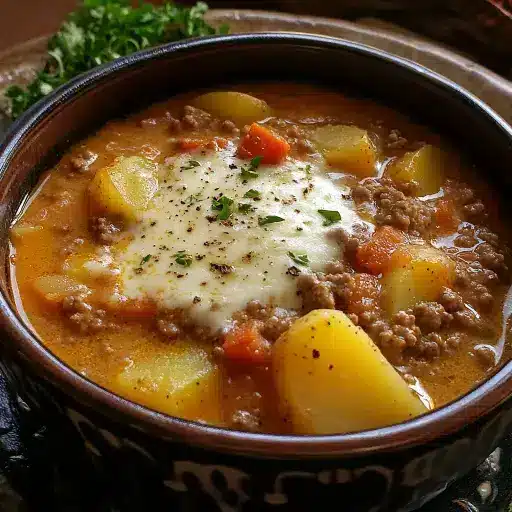 This hearty and comforting Cheesy Hamburger Potato Soup combines the savory goodness of ground beef with tender potatoes, a rich cheesy broth, and aromatic herbs. It’s a quick and easy one-pot meal perfect for a chilly evening, offering a satisfying and flavorful experience that the whole family will love. This soup brings together simple ingredients to create a creamy, cheesy, and utterly delicious dish.