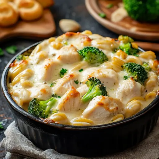 Description: A comforting and satisfying casserole featuring tender chicken, perfectly cooked broccoli, rigatoni pasta, and a rich, creamy Alfredo sauce, all baked to golden, bubbly perfection. This dish is a crowd-pleaser, perfect for weeknight dinners or potlucks.