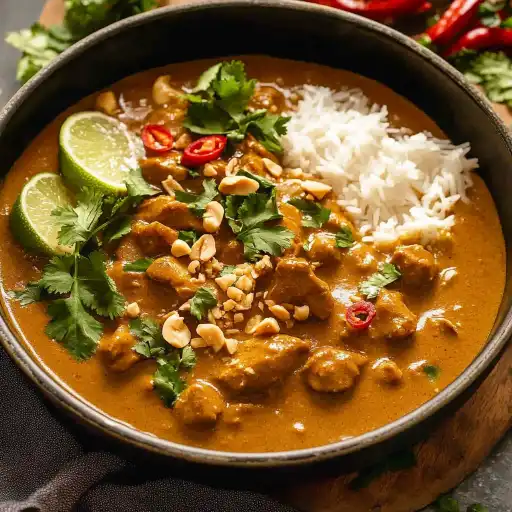 Remove the makrut lime leaves or lemongrass stalk from the curry. Add lime juice to taste, stirring it in to brighten the flavors of the sauce. Taste the curry and adjust the seasoning as needed, adding more salt, sugar, or chili powder to suit your preference. Serve the Chicken Satay Curry hot over rice (jasmine, white rice, or brown rice are all excellent choices). Garnish with chopped peanuts, cilantro/coriander leaves, and fresh chili, if desired.