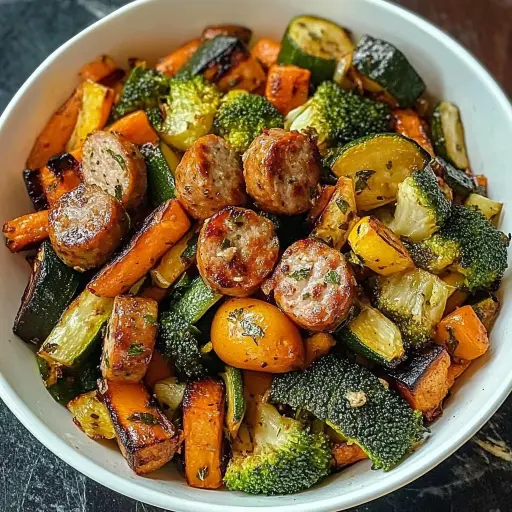 Description: A vibrant and wholesome one-pan meal featuring savory chicken sausage, sweet roasted vegetables, and a delightful blend of seasonings. This recipe is easy to customize, packed with nutrients, and perfect for a quick weeknight dinner or a healthy lunch option.