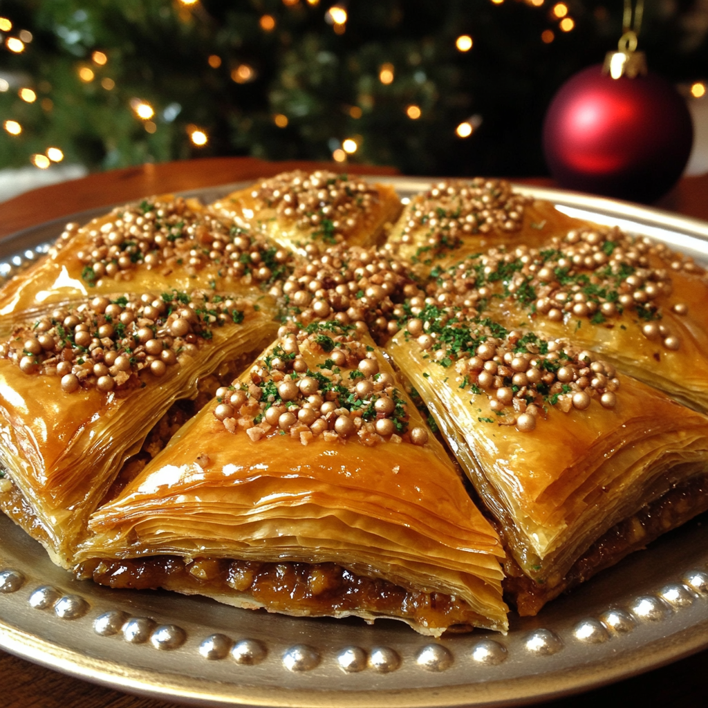 Before serving, garnish the baklava with crushed pistachios, edible gold, or festive red and green sprinkles to add a holiday touch! ✨🎄