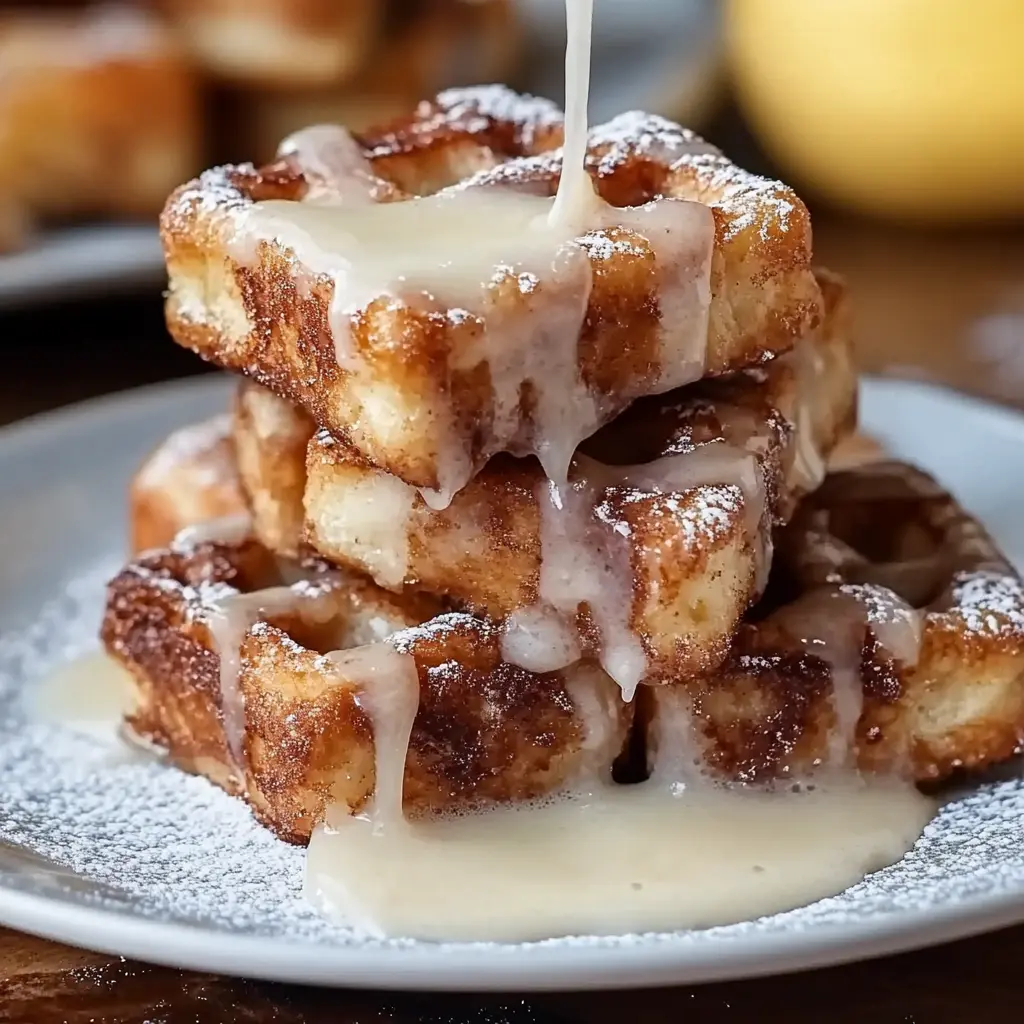 These delightful little morsels are made by soaking cubes of bread in a cinnamon-infused egg mixture, pan-frying them to golden-brown perfection, and then coating them in a generous layer of cinnamon-sugar. For an extra touch of indulgence, a simple glaze is drizzled on top, adding a creamy sweetness that complements the warm spices beautifully.