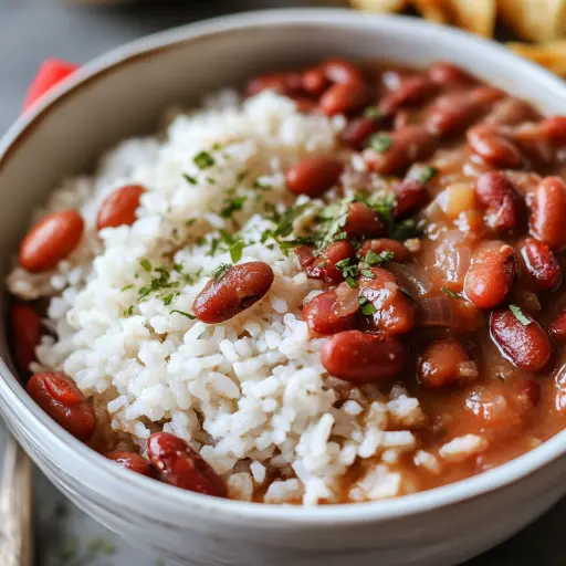 Step 5: To serve, scoop a generous portion of the red beans into a bowl and top with a scoop of cooked rice. Garnish with the crumbled bacon.