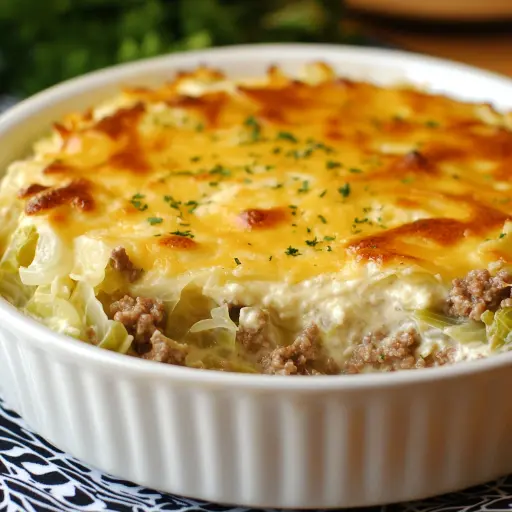 Description: This Creamed Cabbage and Ground Beef Casserole is a comforting and hearty dish that combines tender cabbage, savory ground beef, and a rich, creamy sauce, all topped with a generous layer of melted cheese. It’s a simple yet satisfying meal perfect for a cozy night in.