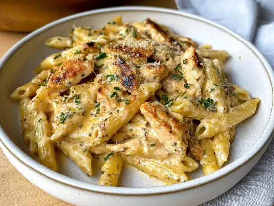 Garnish with extra Parmesan cheese and fresh herbs, such as parsley or basil, for a pop of color and freshness. Serve the Creamy Rotisserie Chicken Pasta hot and enjoy!