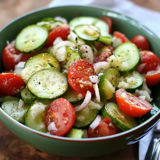 This Cucumber, Onion, and Tomato Salad isn’t just a recipe; it’s a summer staple. Its simplicity is its strength, making it incredibly easy to prepare even on the busiest weeknights. The combination of crisp cucumbers, juicy tomatoes, and the slight bite of red onion creates a delightful textural contrast. The tangy vinaigrette ties everything together, enhancing the natural flavors of the vegetables without overpowering them. Plus, it’s incredibly versatile, pairing well with a wide range of dishes. Beyond its taste, it’s also a healthy choice, packed with vitamins, minerals, and antioxidants. It’s a refreshing and light option that won’t weigh you down. It’s also incredibly adaptable. Don’t have red onion? Use white or yellow. Prefer a different herb? Dill, mint, or chives are all great alternatives. You can also add crumbled feta cheese, olives, or avocado for extra flavor and texture. Ultimately, this salad is a blank canvas for your culinary creativity. It’s a recipe that encourages experimentation and personalization, allowing you to tailor it to your own taste preferences. You’ll love how it brightens up any meal, adding a touch of freshness and vibrancy to your table.