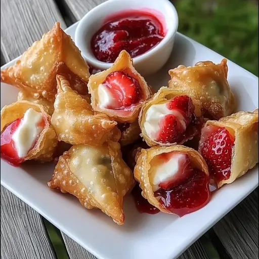 Description: Bite-sized delights that combine the crispy texture of fried wontons with the creamy, sweet indulgence of strawberry cheesecake. These Deep-Fried Strawberry Cheesecake Stuffed Wonton Bites are a perfect party appetizer or a fun, easy dessert that will impress your guests with their unique flavor and presentation.