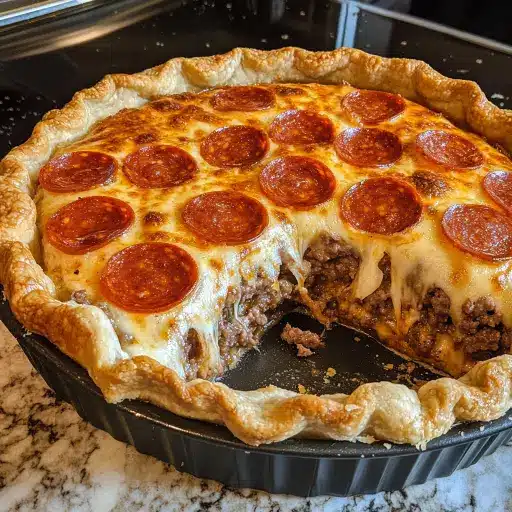 This Deep Dish Hamburger Sausage Pepperoni Pie is a guaranteed crowd-pleaser for several reasons. First, it combines the comforting flavors of pizza with the satisfying heartiness of a pie, creating a dish that’s both familiar and exciting. The deep-dish format ensures a substantial, filling meal that’s perfect for family dinners, game nights, or potlucks. The recipe is also highly customizable; you can easily adjust the ingredients to suit your preferences and dietary needs. Whether you’re a fan of spicy sausage, extra cheese, or a vegetarian twist, this pie can be adapted to your liking. Moreover, the use of ready-bake pie crusts makes this recipe relatively quick and easy to prepare, even on busy weeknights. Serving Suggestions: