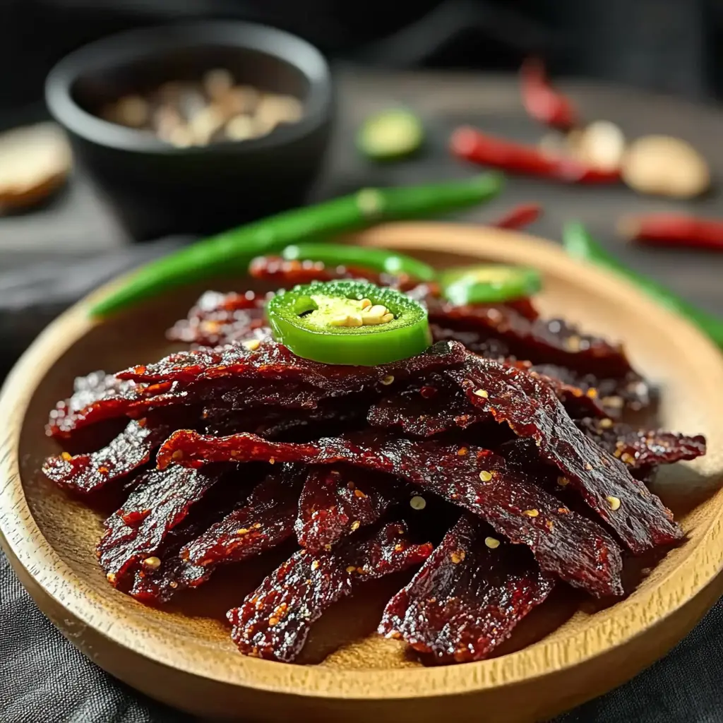 A: To increase the heat level of this jerky, you can add more jalapenos or use hotter varieties of peppers, such as serrano peppers or habaneros. Be sure to handle hot peppers with care, wearing gloves to avoid skin irritation. You can also add a pinch of cayenne pepper or red pepper flakes to the marinade for an extra kick. Adjust the amount of peppers to suit your personal preference for spiciness.