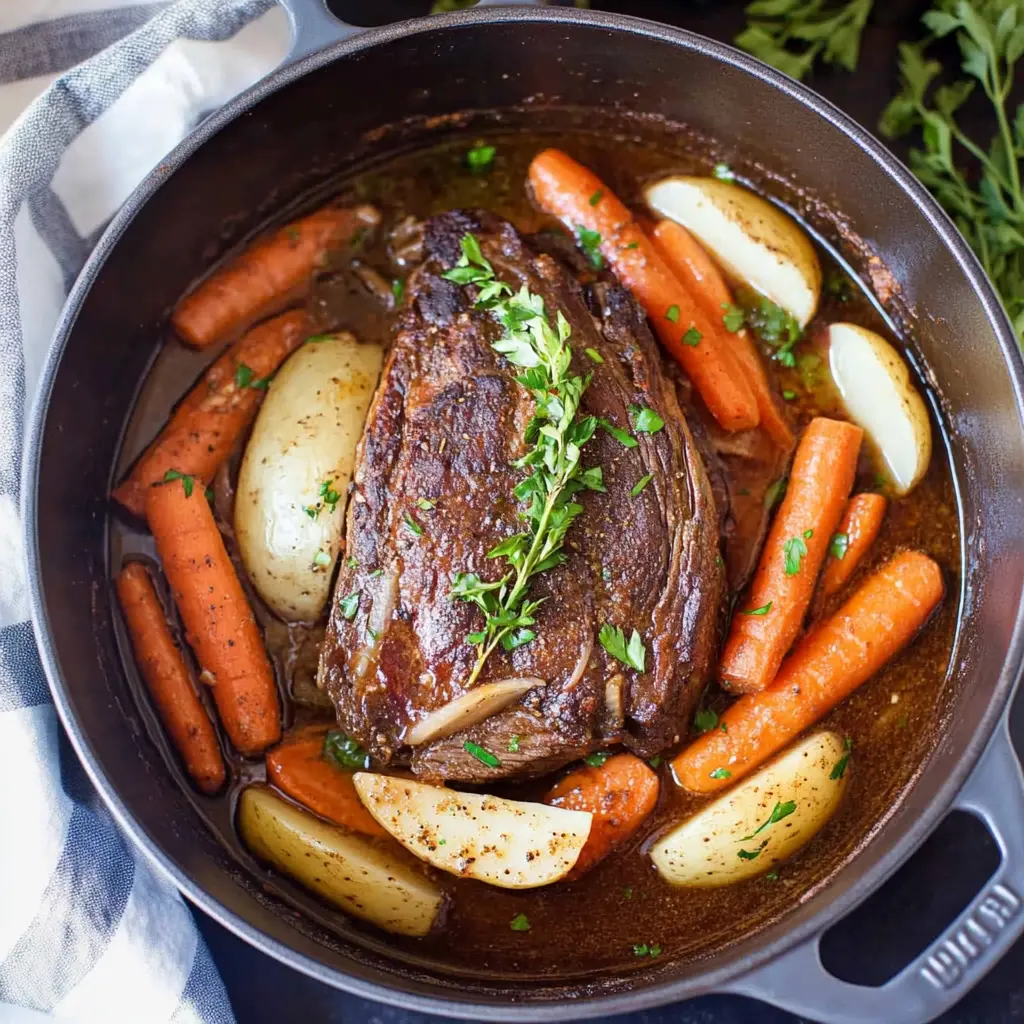 Description: This classic Dutch oven pot roast recipe delivers fork-tender beef, melt-in-your-mouth carrots, and perfectly cooked potatoes, all simmered in a rich and savory broth. It’s the ultimate comfort food, perfect for a cozy family dinner on a chilly evening.
