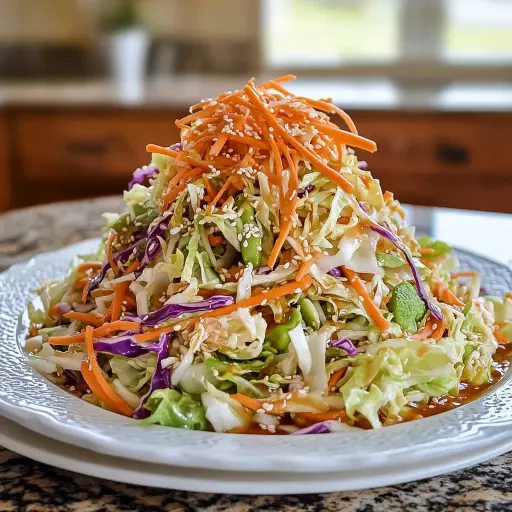 Description:This vibrant and flavorful Asian Cabbage Slaw is a delightful combination of crisp, fresh vegetables tossed in a tangy and slightly sweet sesame vinaigrette. It’s an easy-to-make, no-cook recipe perfect as a side dish, a light lunch, or a topping for grilled meats and fish. The toasted nuts and sesame seeds add a satisfying crunch, while the optional chow mein noodles take it to the next level. It’s a guaranteed crowd-pleaser!