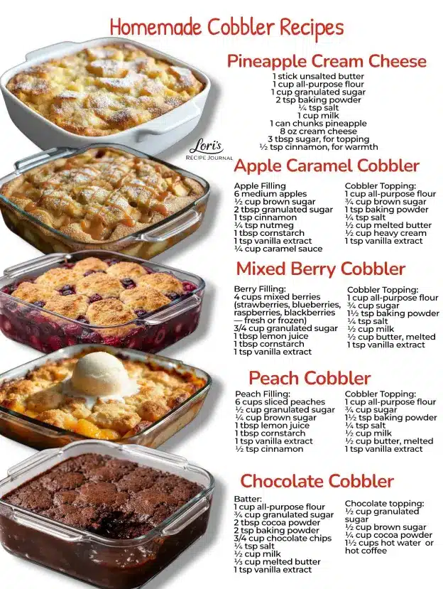 Craving classic homemade cobbler recipes? This must-save dessert guide features pineapple cream cheese cobbler, apple caramel cobbler, mixed berry cobbler, peach cobbler, and rich chocolate cobbler—all easy, cozy, and made from scratch. Perfect for family gatherings, holiday desserts, or weekend baking, these old-fashioned cobblers are warm, comforting, and irresistible served with ice cream. Save this pin for the best cobbler recipes and simple homemade desserts everyone will love!