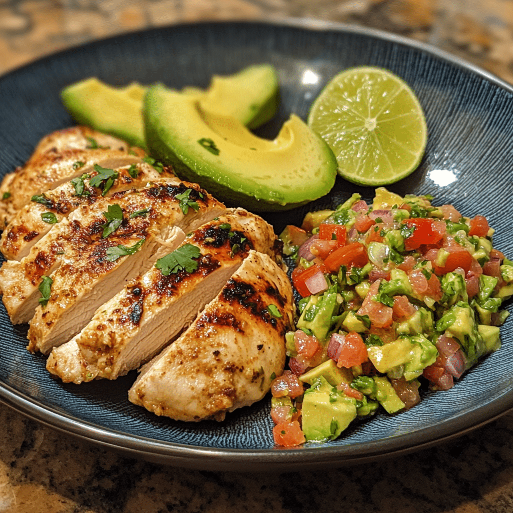 Once the chicken is cooked through, remove it from the oven and let it rest for a few minutes before slicing. To serve, spoon a generous amount of the fresh avocado salsa onto a plate and top it with the sliced chicken. This dish pairs beautifully with rice, quinoa, or tortilla chips, making it a versatile option for any meal.
