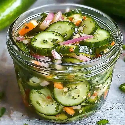 Description: This crisp and refreshing Fresh Pickled Cucumber Salad is a simple yet satisfying dish that’s perfect as a snack, side, or even a light lunch. The combination of thinly sliced cucumbers, sweet onion, and a tangy vinegar brine creates a flavor explosion that gets better with time. It’s quick to prepare, requires minimal cooking, and can be stored in the refrigerator for weeks, making it a fantastic make-ahead option. The addition of fresh dill and a touch of red pepper flakes adds layers of complexity, making this salad a guaranteed crowd-pleaser.
