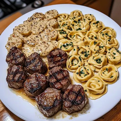 Description: Indulge in a restaurant-quality meal at home with this decadent Garlic Butter Steak paired with creamy, cheesy Alfredo Tortellini. Juicy, perfectly seared steak is infused with rich garlic butter, while the tortellini is coated in a luxurious homemade Alfredo sauce. This dish is surprisingly easy to make and will impress your family and friends.