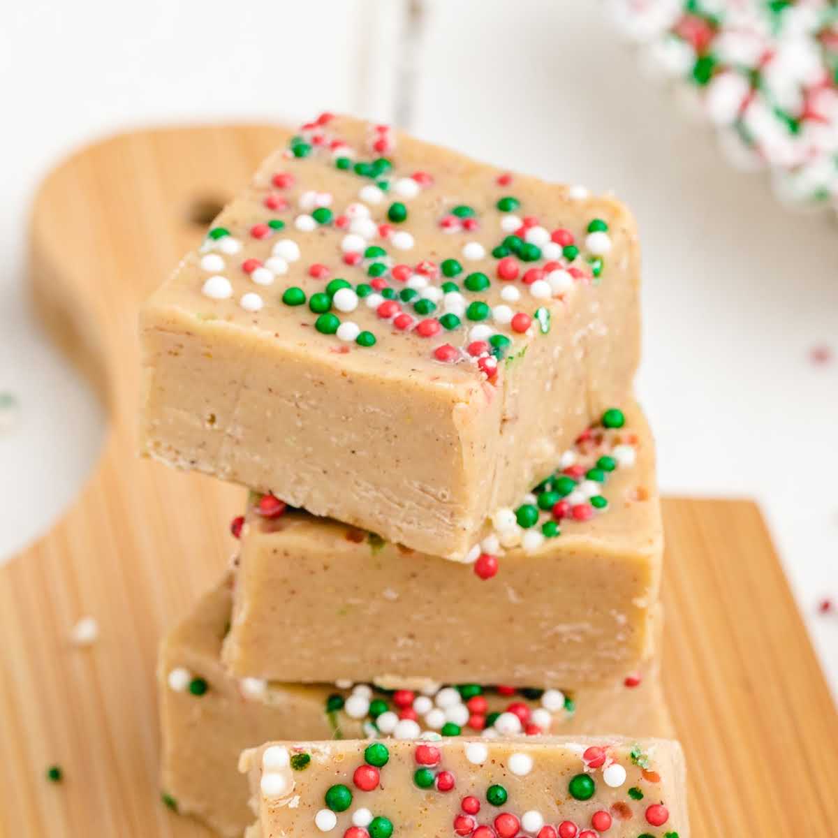 If desired, sprinkle seasonal nonpareils over the slightly damp fudge. The nonpareils add a festive touch and a bit of texture to the finished fudge. Lightly pat down the nonpareils with your fingers to help them adhere to the fudge. This step is best done while the fudge is still slightly warm, as the nonpareils will adhere more easily.