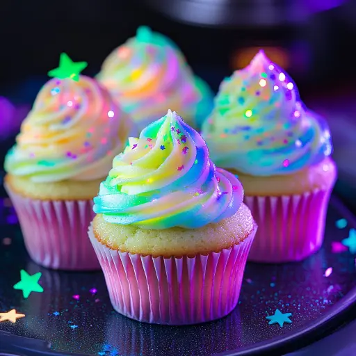 Once the cupcakes are completely cool, spread or pipe the glowing frosting onto each cupcake. For a dazzling effect, sprinkle edible glitter and star-shaped sprinkles over the frosting. To see the magic unfold, use a black light to test the glow effect—the frosting should emit a subtle, captivating glow!