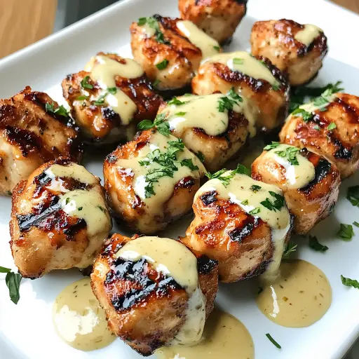 Step 6: Serve: Remove the grilled chicken bites from the grill and arrange them on a serving platter. Drizzle generously with the Creamy Garlic Sauce. Garnish with fresh parsley or chives, if desired. Serve immediately and enjoy!