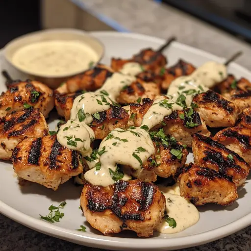 Description: These grilled chicken bites offer a delightful combination of tender, perfectly seasoned chicken and a luscious, creamy garlic sauce. Ideal as an appetizer, snack, or light meal, they’re sure to be a hit with everyone!